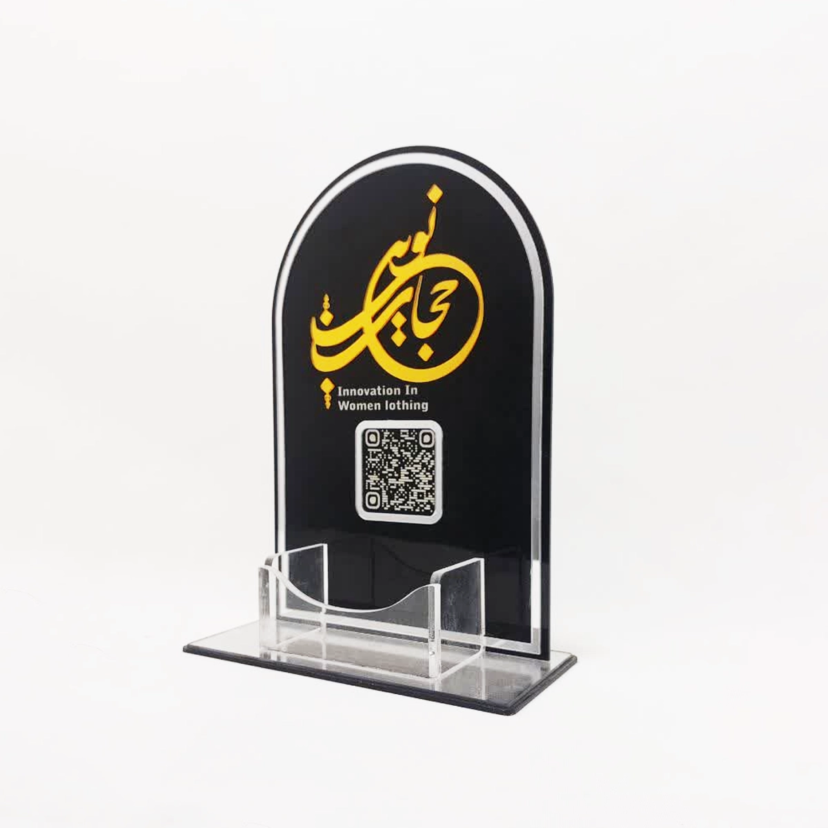 ترکیب رنگ مشکی و طلایی،فرم منحنی و QR کد مرکزی،جلوه ای حرفه ای و قابل اعتماد به این استند بخشیده.در بخش جلویی استند،جایگاه مخصوص برای قرار دادن کارت ویزیت تعبیه شده تا ارتباط مستقیم با مخاطب و معرفی برند تسهیل شود.