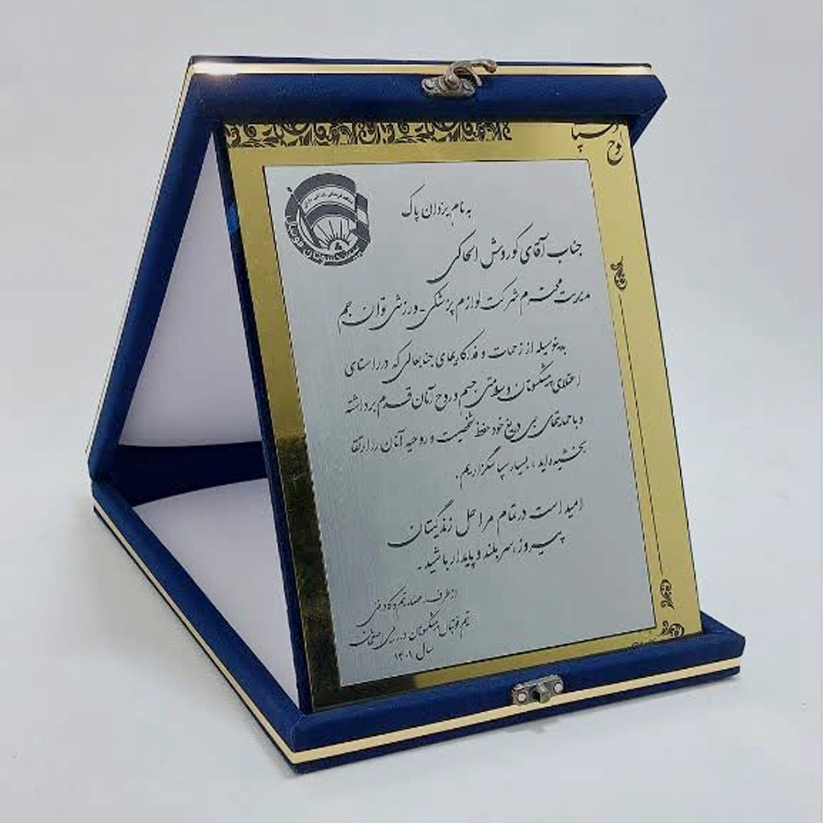 به مدیریت محترم شرکت لوازم پزشکی-ورزشی توان جم با طراحی رسمی و ترکیب رنگ‌های متالیک، به‌منظور تجلیل از عملکرد و همکاری مؤثر در حوزه سلامت و ورزش تولید شده است.