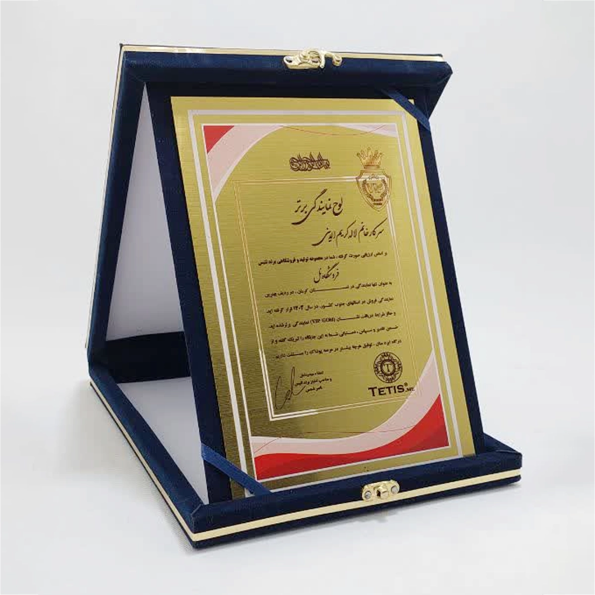 لوح تقدیر نمایندگی برتر شرکت تتیس با طراحی رسمی و جلوه‌ای لوکس، به‌منظور تجلیل از عملکرد موفق نماینده فروش در حوزه محصولات این شرکت تولید شده است.