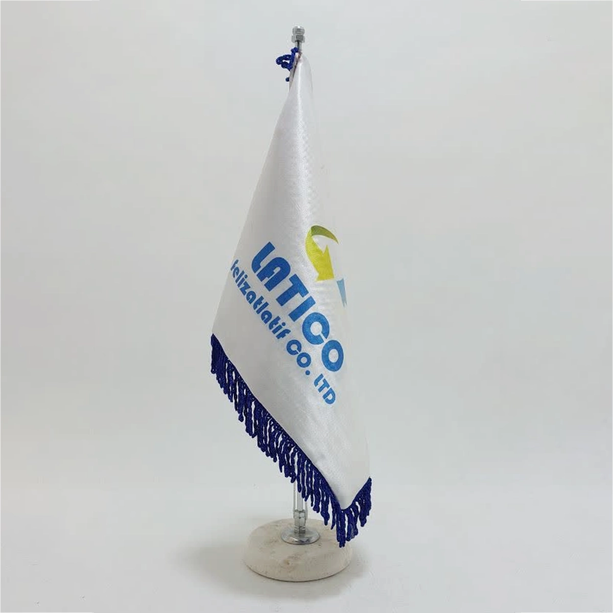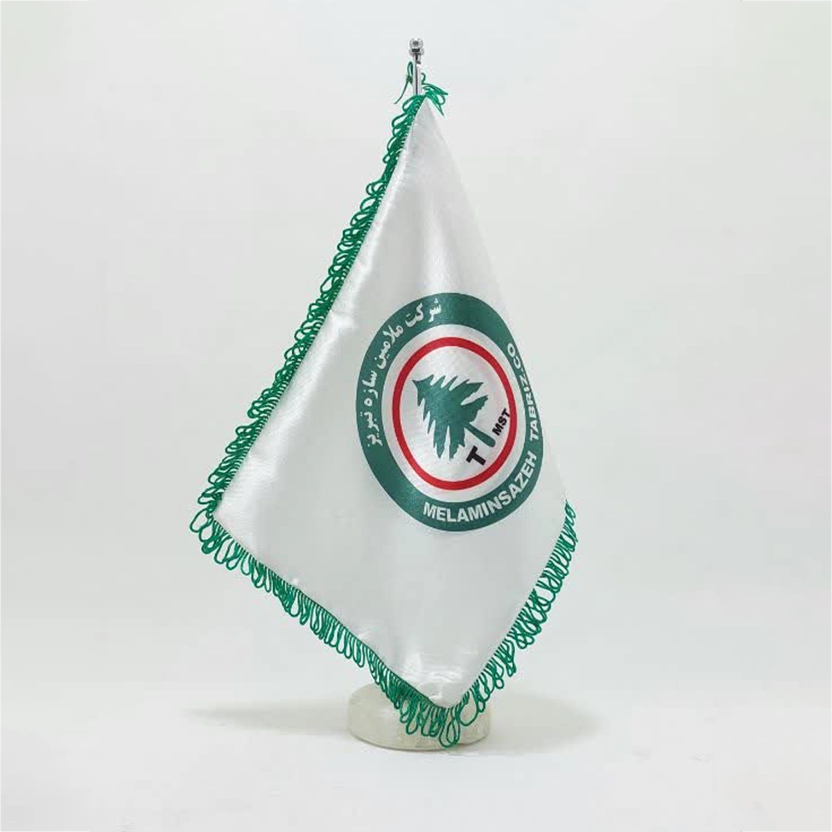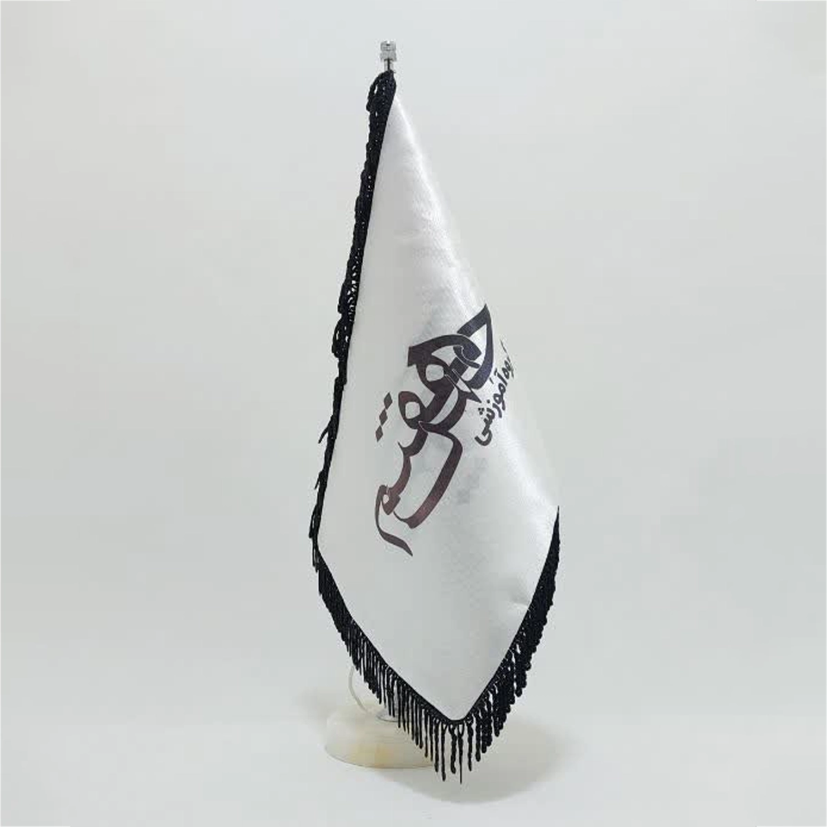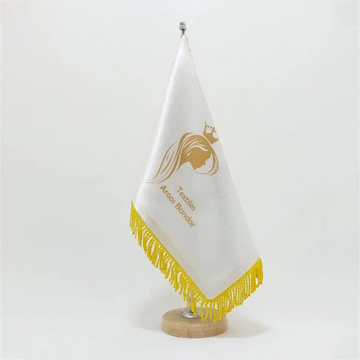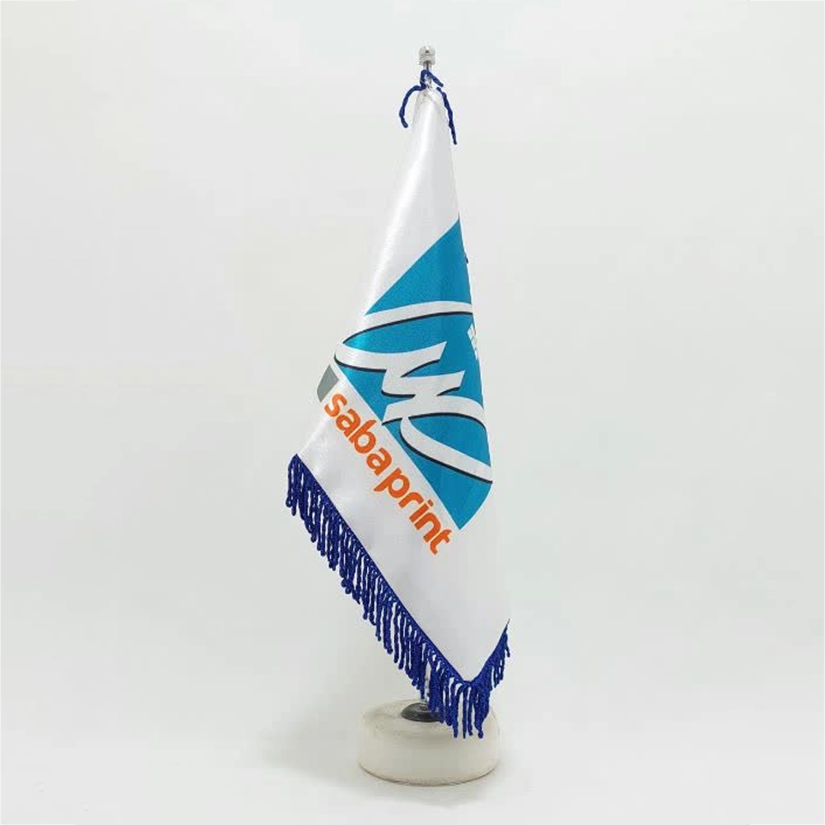 پرچم رومیزی اختصاصی با چاپ سابلیمیشن؛این نوع پرچم ها معمولا روی پارچه ساتن براق تولید می شن که هم ایستایی خوبی داره،هم جلوه ای رسمی شیک.